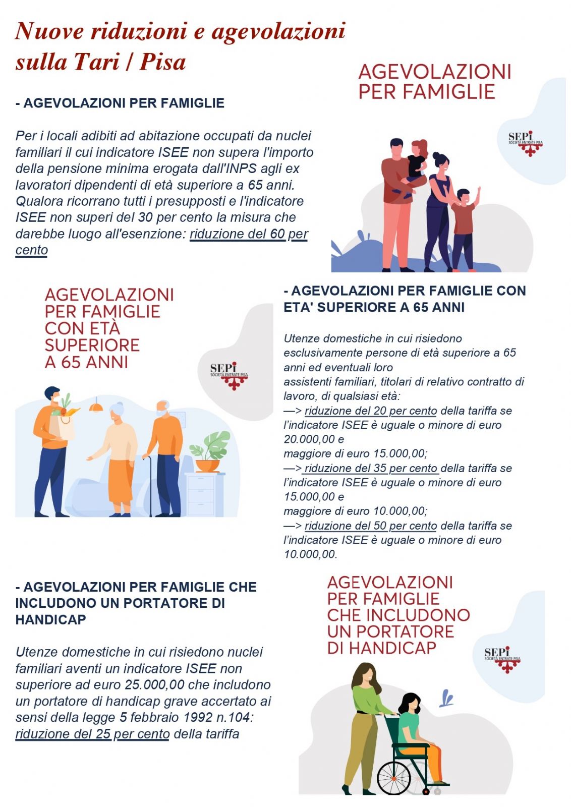 - utenze domestiche in cui risiedono esclusivamente persone di età superiore a 65 anni ed eventuali loro assistenti familiari, titolari di relativo contratto di lavoro, di qualsiasi età con riduzioni del 20% se l’indicatore ISEE è uguale o minore di euro 20mila euro e maggiore di 15mila euro; riduzioni del 35% della tariffa se l’indicatore ISEE è uguale o minore di 15mila e maggiore di 10mila euro; riduzioni del 50 per cento della tariffa se l’indicatore ISEE è uguale o minore di 10mila euro.